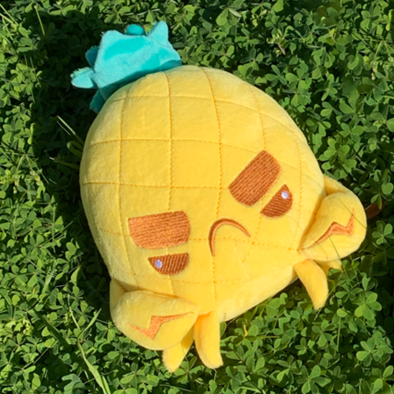 Hi, Pineapple Crab! They may be grumpy, but they're a very round and soft friend. Pineapple Crab has been embroidered with a quilting pattern to replicate that tropical fruit feel in a fun and whimsical way. This boyo measures 9"/22.5cm from his legs to the top of his fronds, and 6.75"/17cm from claw to claw.