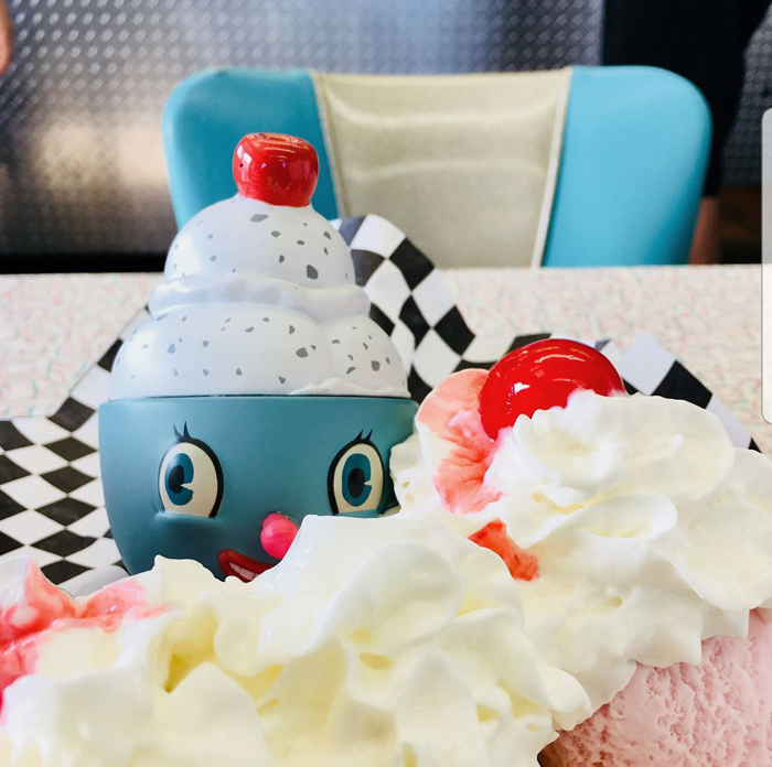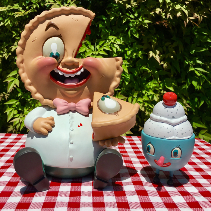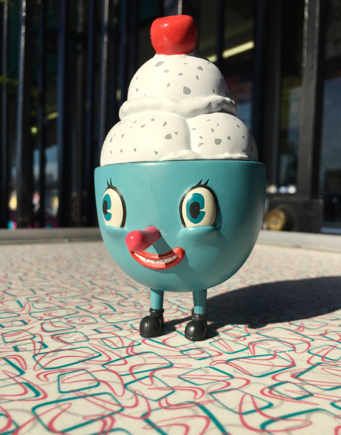 Based on the Nouar’s original 2012 painting by the same name this designer toy stands (well sits) 9 Inches tall. Mister Self Indulgence comes accompanied by his little buddy - “Lil’ Scoopy” - an ice cream sundae character. He is 4 Inches in height - a great stand alone piece all to himself. You get the pair in one beautiful window box display.