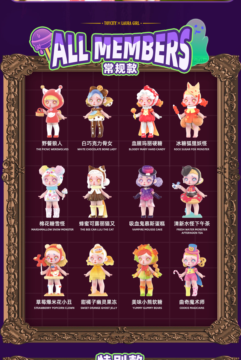 Laura invites you to the Sweet Monster Happy Theater, where they play cute characters and create a sweet atmosphere with desserts. Until midnight, the crowd dispersed, the dragon hiding behind the scenes spit out the mysterious purple potion, and a new revel began. Each set of 12, 9 regular models, 3 special models.