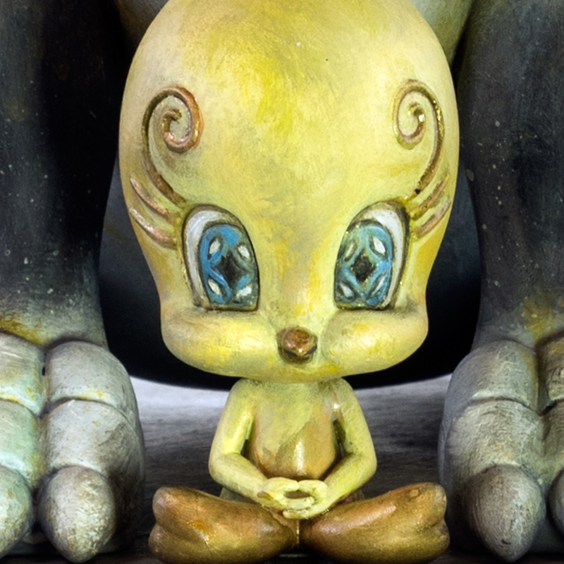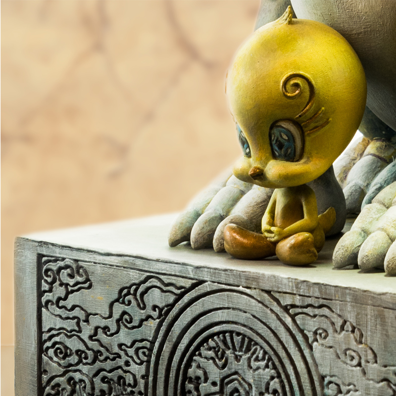 Tik Ka From East rendition of Sylvester and Tweety as a Foo Dog sculpture. This piece has all the hallmarks from his signature style and is a must for fans of Looney Tunes.
