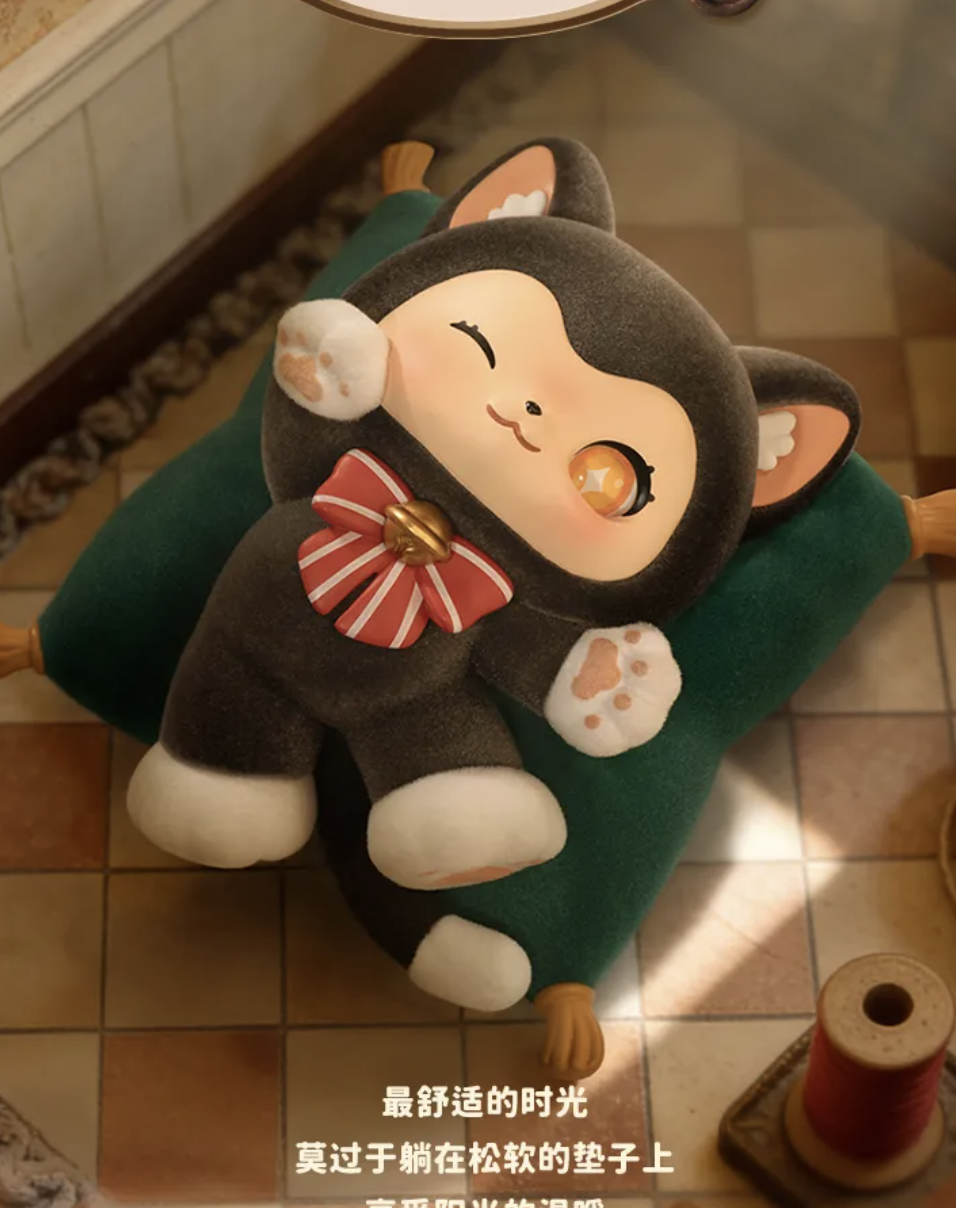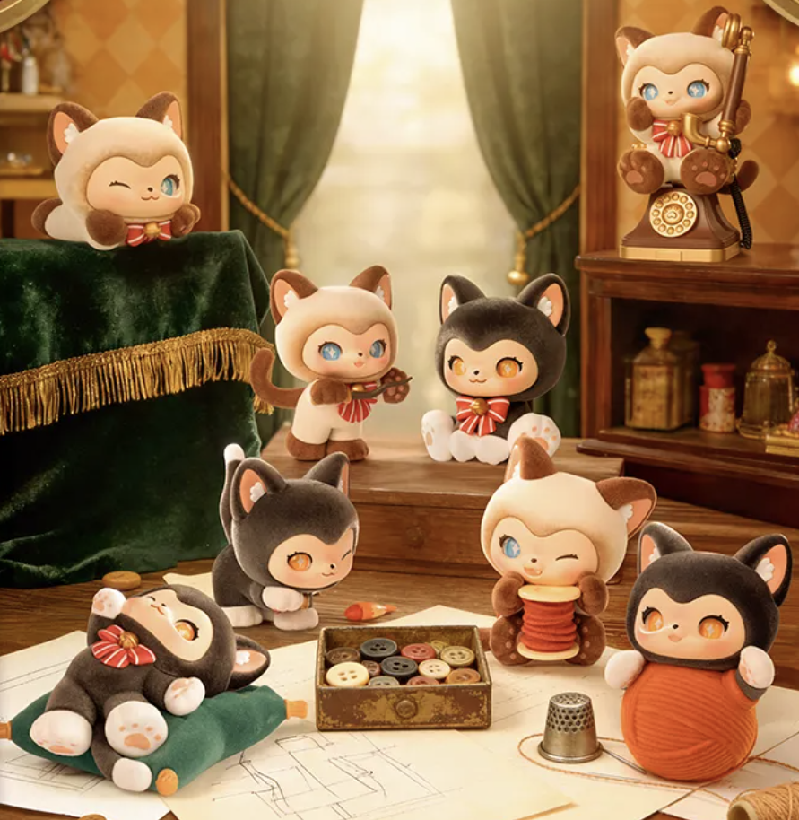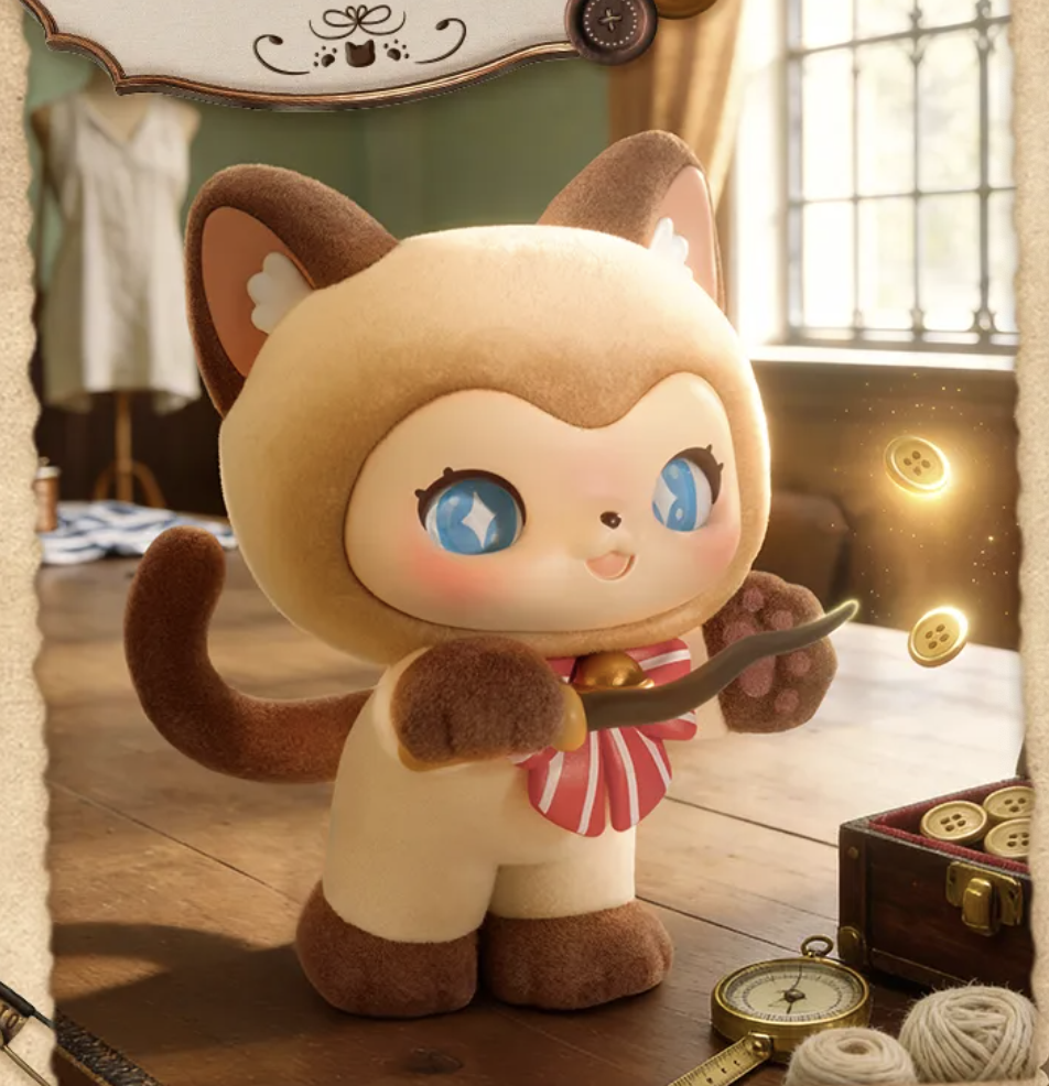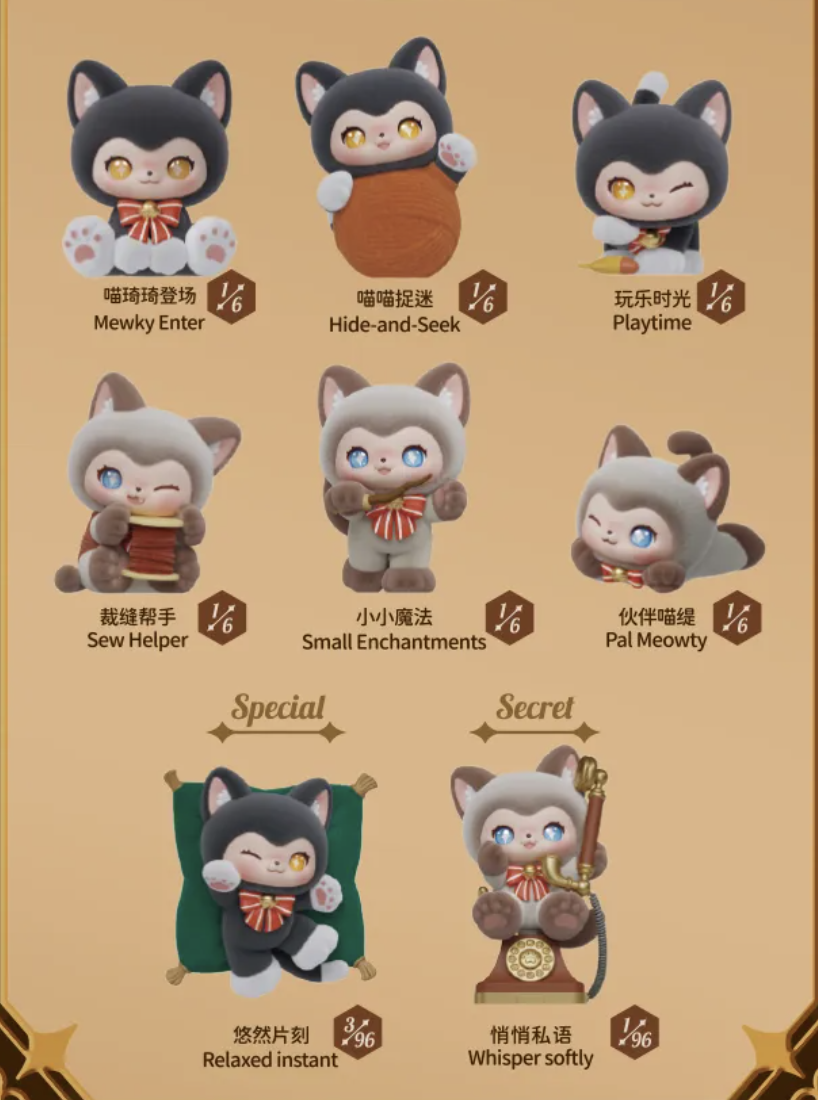 The "MOFFY'S Magic Tailor Shop" on the street corner always glows with a warm golden light. Inside lives the magical kitten MEWKY and its best friend MEOWTY, where heartwarming antics unfold every day. This is MEWKY's first blind box set, "MOFFY'S Magic Tailor Shop," documenting their heartwarming daily life at the magical tailor shop. 3.42 inch